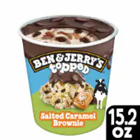 Indulge in the perfect combination of creamy ice cream, rich brownie chunks, and a salty sweet caramel swirl. This Ben & Jerry's Topped Salted Caramel Brownie Ice Cream Pint contains real ingredients and is sure to satisfy any ice cream lover. Treat yourself to a taste of pure deliciousness.